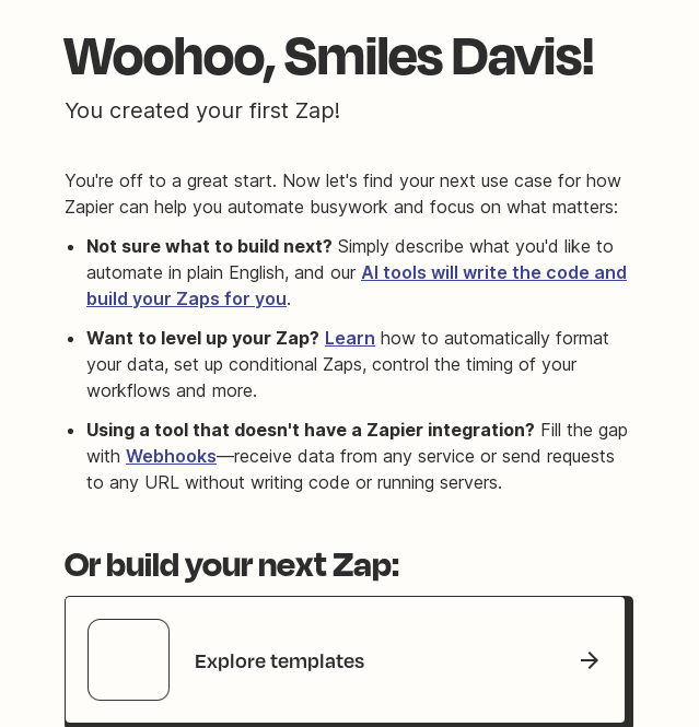 Refer back to the Zapier example we showed before: they send a follow-up when someone creates their first automation, offering simple next steps like exploring templates or learning advanced features, helping users move forward before frustration turns into a support ticket.